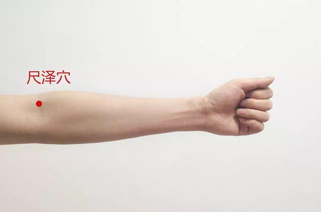 位于手臂肘部横纹上,取穴时先将手臂上举,在手臂内侧中有粗腱,腱的外侧就是尺泽。